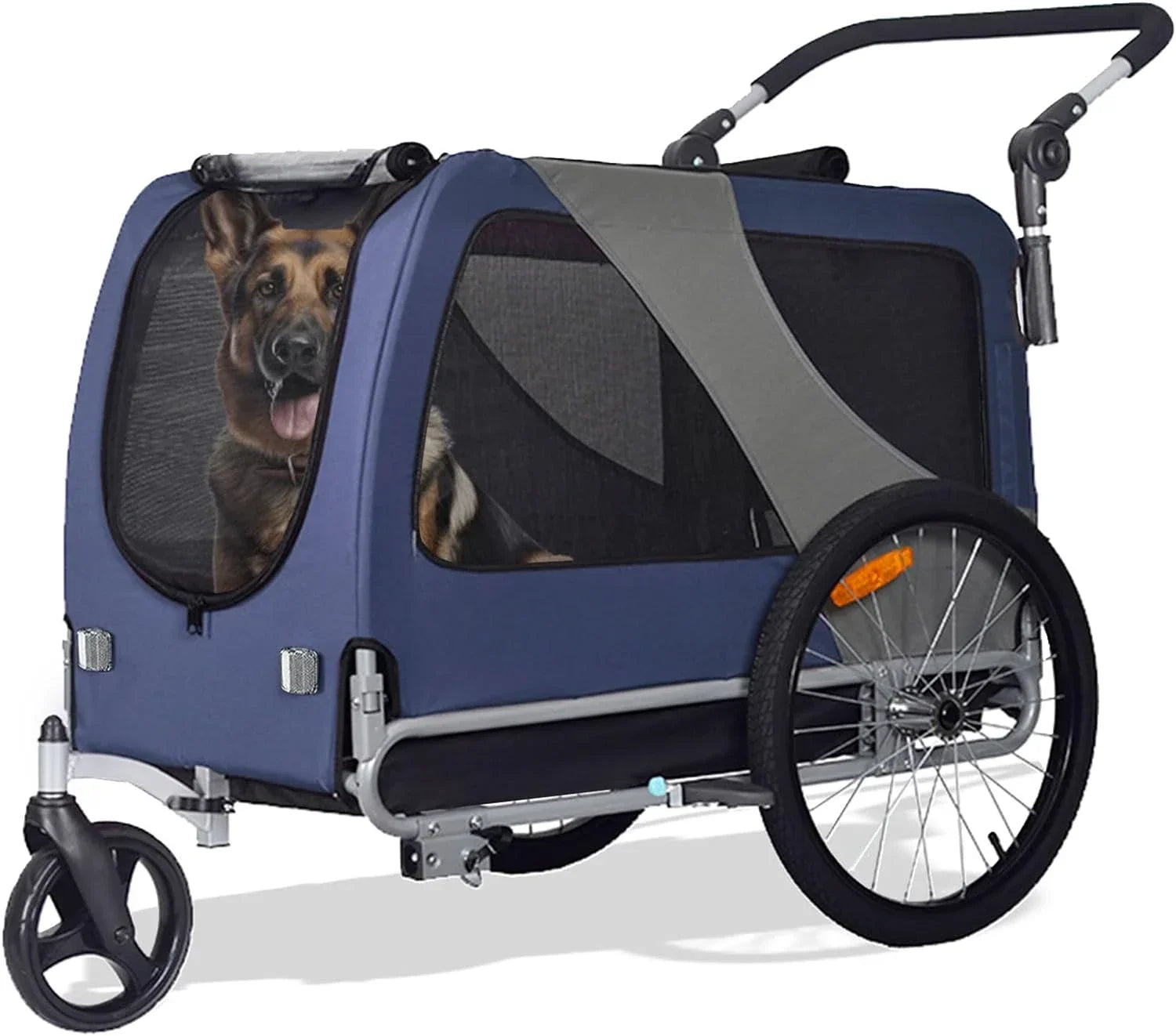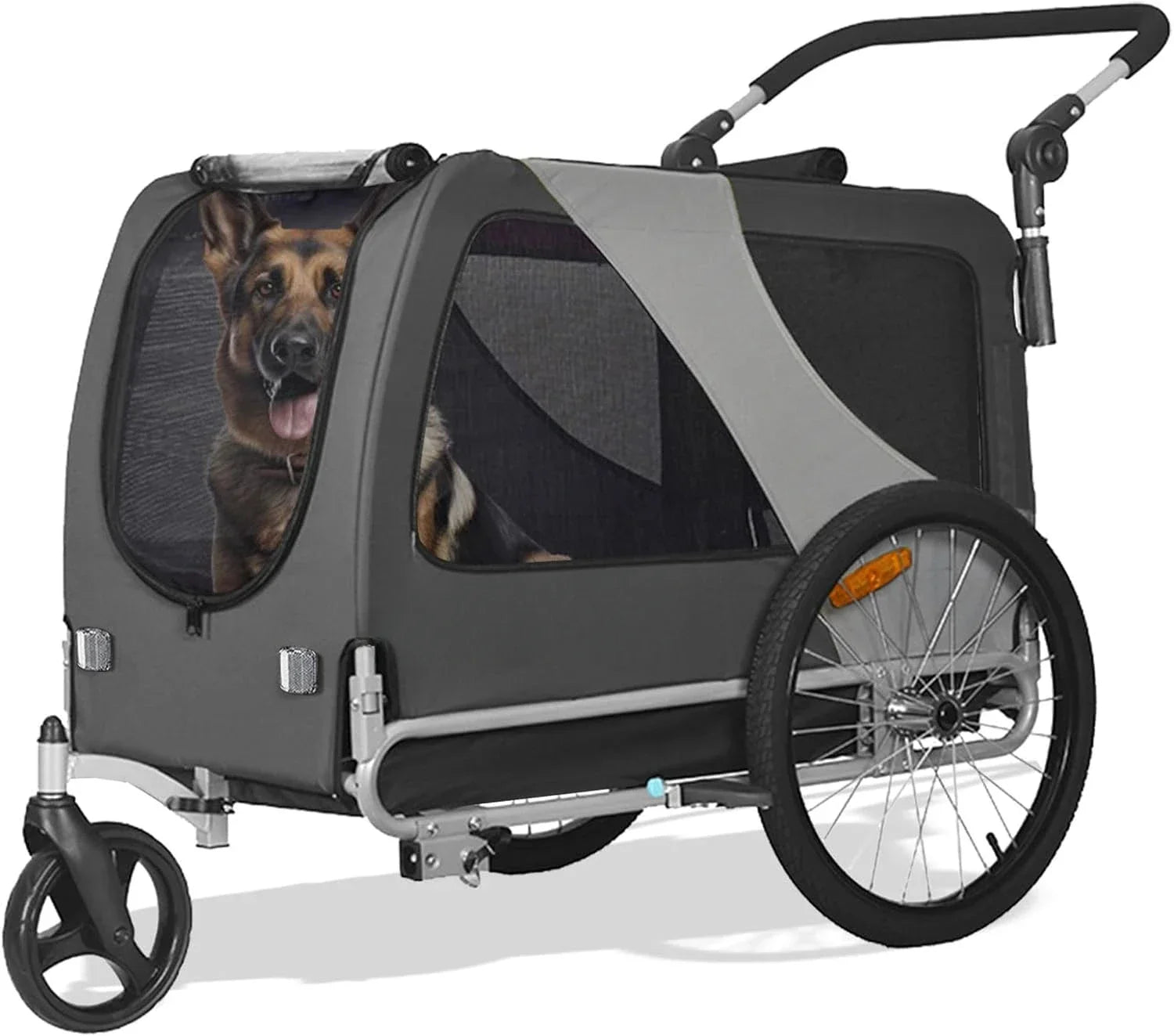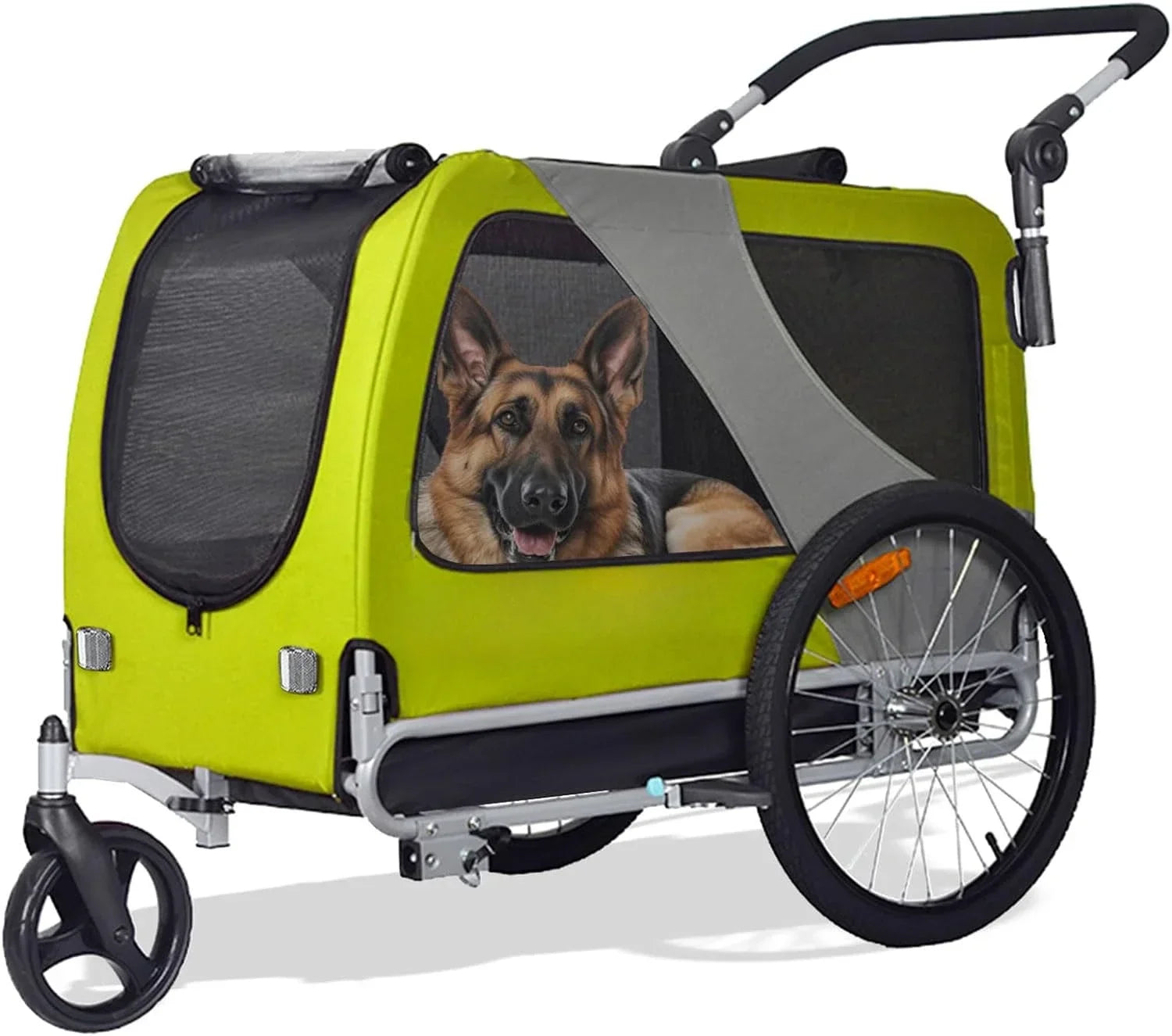 تم تصنيع هذه المقطورة/عربة الحيوانات الأليفة بإطار قوي ومواد عالية الجودة، وهي توفر الموثوقية والراحة لك ولحيواناتك الأليفة. مع ميزات الأمان القابلة للتعديل، مثل ملحقات المقود الآمنة والعاكسات للرؤية، يمكنك اصطحاب حيواناتك الأليفة بثقة في أي مغامرة.
