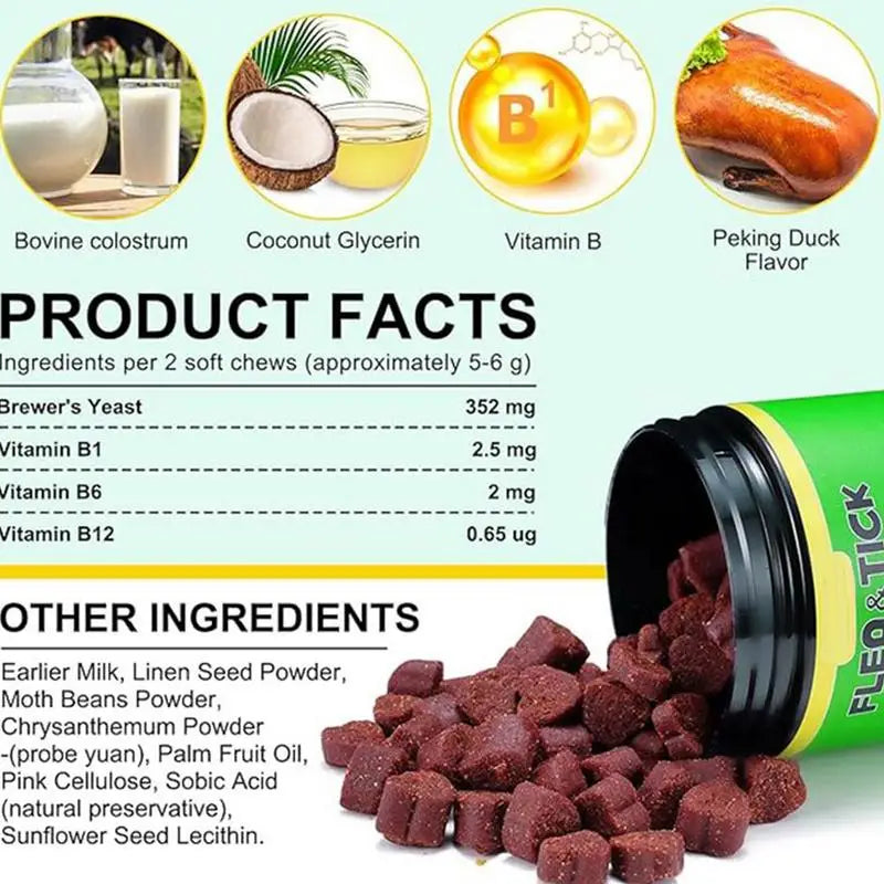 Protect your dog from fleas and ticks with this effective and natural Flea and Tick Prevention supplement. Each pack contains 60 chewables, formulated with safe, all-natural ingredients to help prevent flea and tick infestations. These fast-acting chewables provide long-lasting protection for dogs of all breeds and ages, ensuring your pet stays comfortable and pest-free.